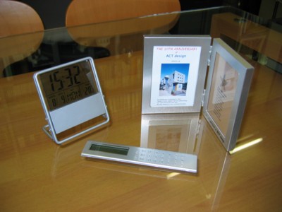 透明なガラス面に時間が浮き出る 不思議な時計。 電卓と定規が一緒になった便利な文房具。 アルミ製の写真立て。 |